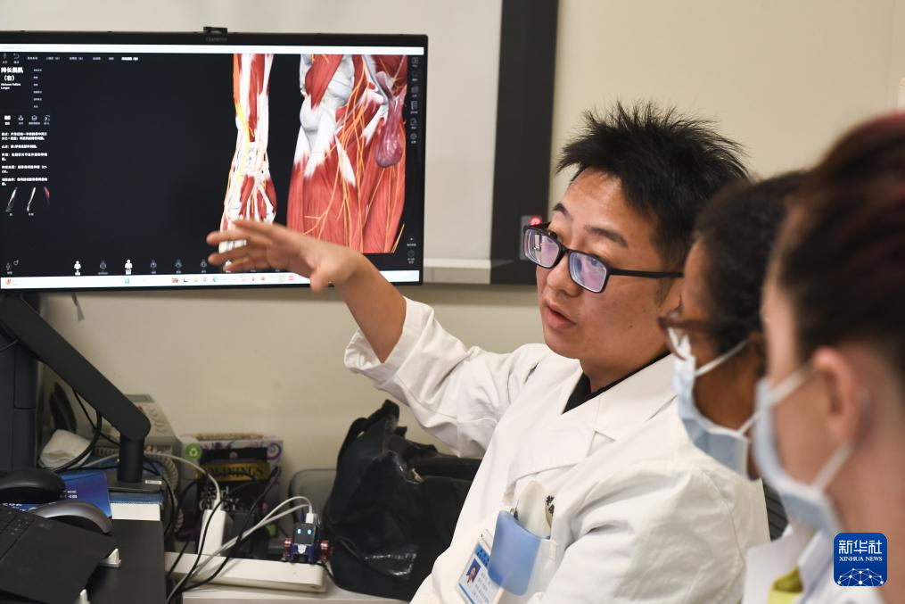 10月22日,在南京鼓樓醫院,中醫科醫生為來自不同國家的見習醫生講解中醫術。