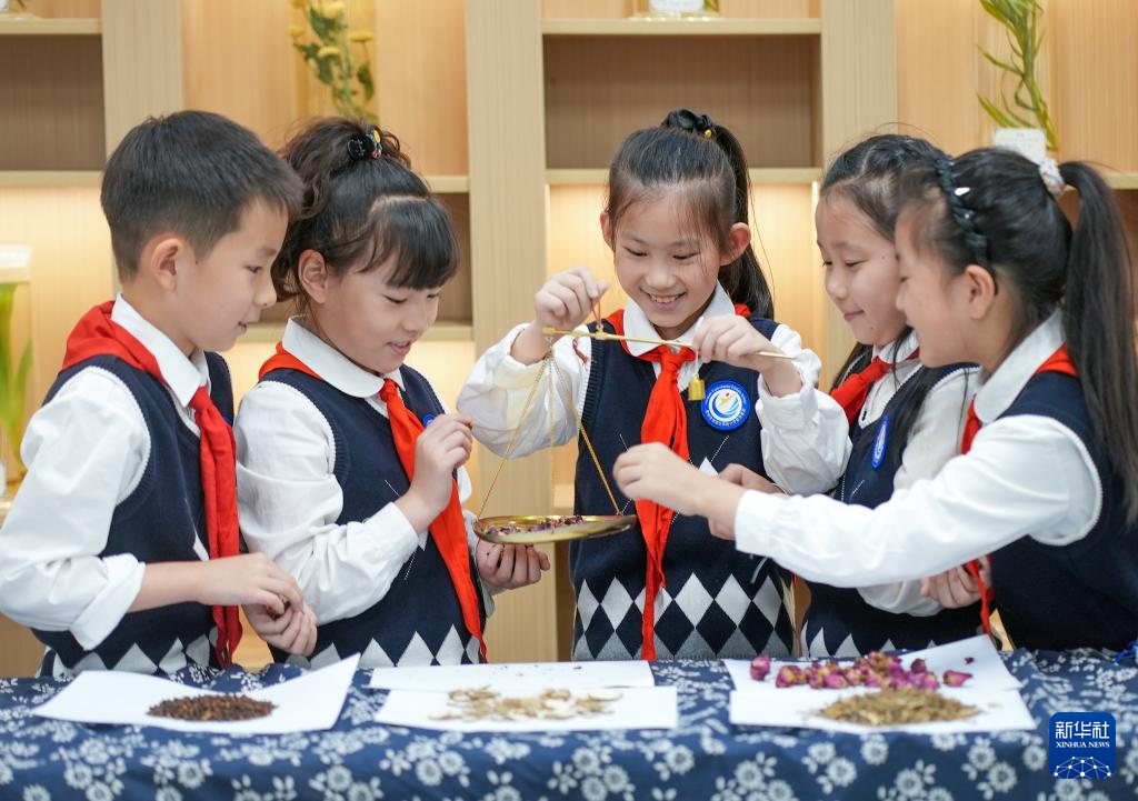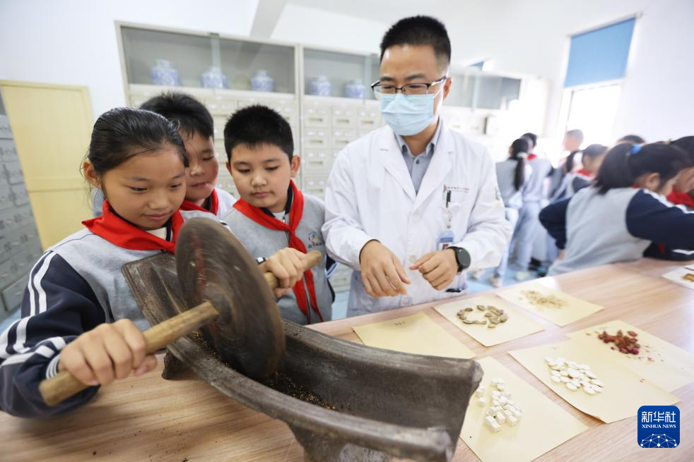 10月21日,山東省棗莊市市中區文化路小學的學生在一家中藥店體驗用銅沖搗藥。