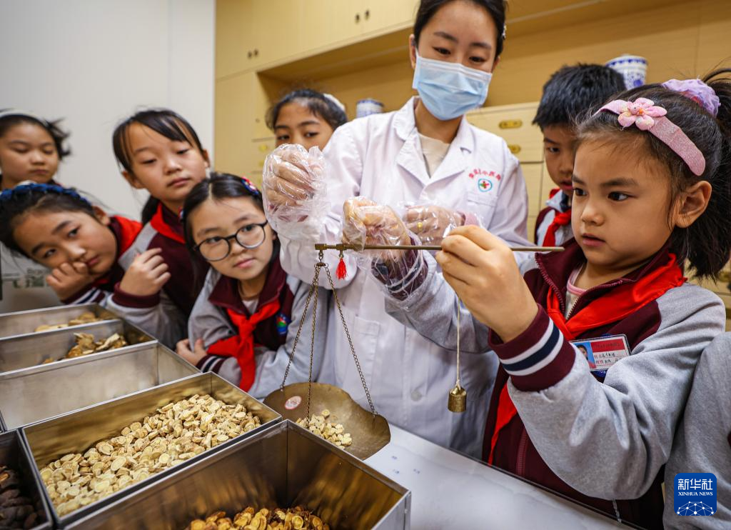 10月22日,在山東省榮成市中醫院中醫藥科普館,學生學習稱量中藥材。