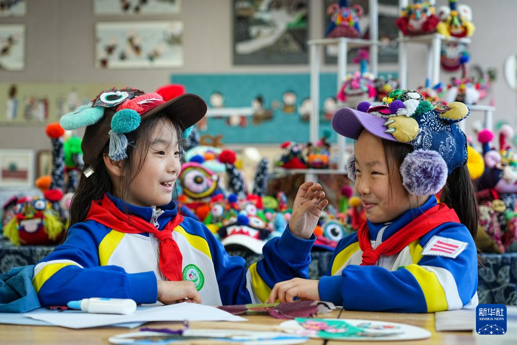10月22日,淄博市博山區四十畝地小學學生頭戴自己創作的布貼畫頭飾。