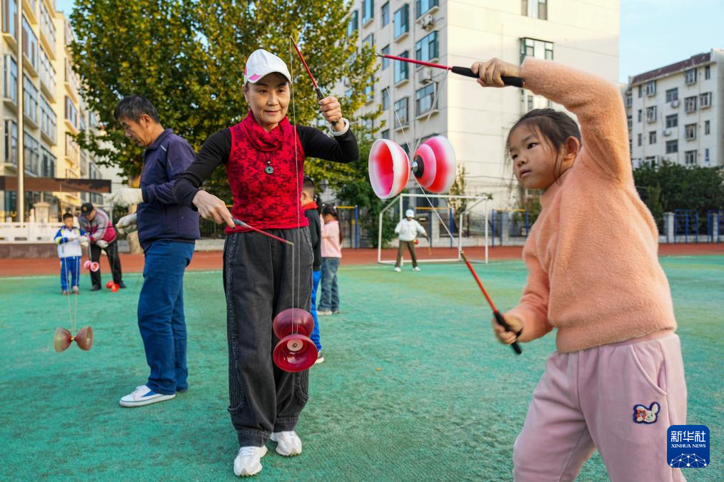 10月22日,志愿者在淄博市博山區中心路小學為學生們傳授抖空竹。