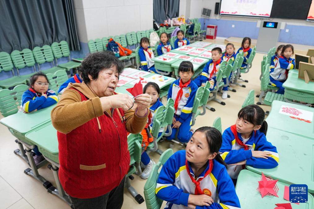 10月22日,志愿者王彬在淄博市博山區中心路小學為學生傳授傳統剪紙技藝。