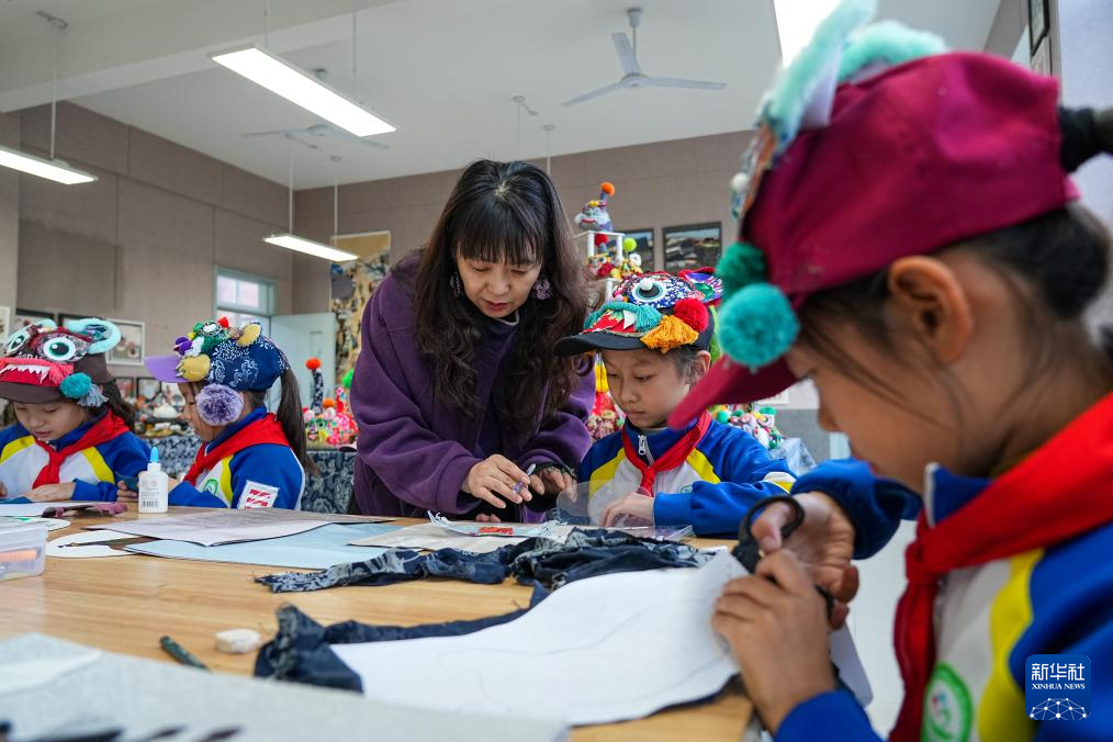 10月22日,淄博市博山區四十畝地小學教師韓曉英在輔導學生創作布貼畫。