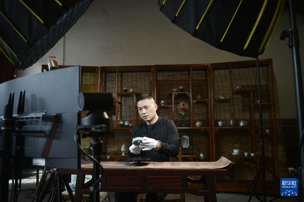 10月22日,河南省汝州市“宋京御窯廠”的汝瓷藝人趙永恒準備通過線上直播推廣汝瓷作品。