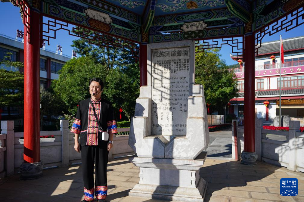 10月23日,一名講解員在云南省普洱市寧洱哈尼族彝族自治縣民族團結園內為游客介紹民族團結誓詞碑。