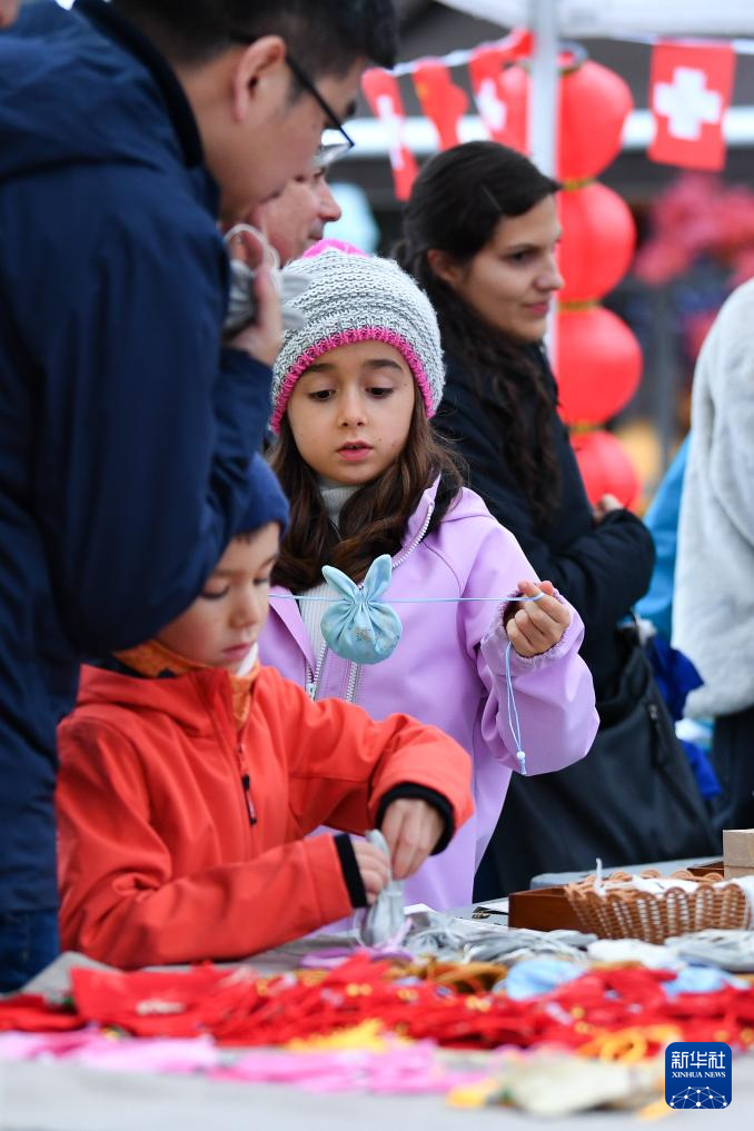 10月25日,在瑞士首都伯爾尼,小朋友在“遇見中國”文化節上體驗制作香囊。