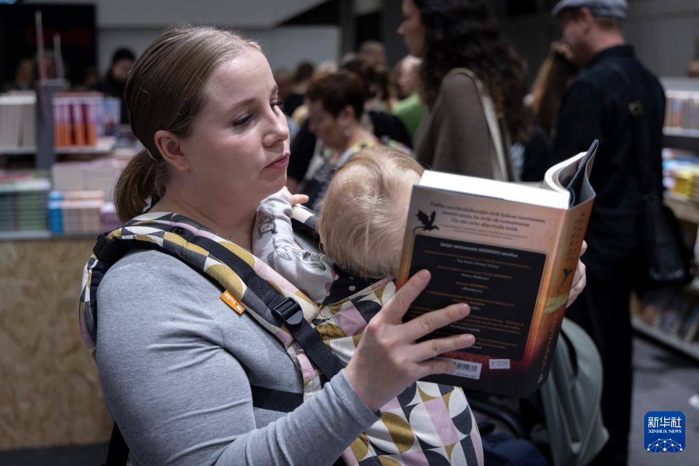 10月25日,在芬蘭首都赫爾辛基會展中心舉行的第25屆赫爾辛基書展上,一名帶著孩子的女子閱讀書籍。