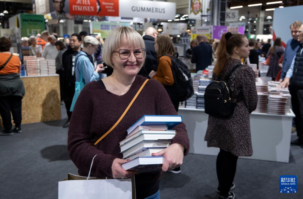 10月25日,在芬蘭首都赫爾辛基會展中心舉行的第25屆赫爾辛基書展上,一名女子懷抱選購的書籍。