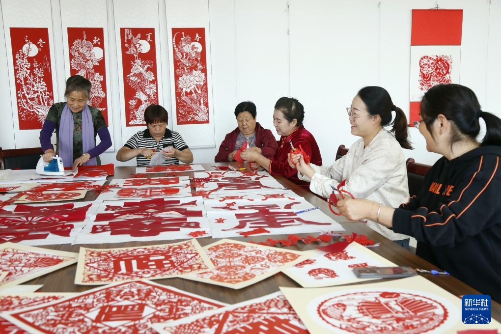 10月10日,在河南省洛陽市汝陽縣人民文化館,剪紙協會人員給社區老人剪祝福語。