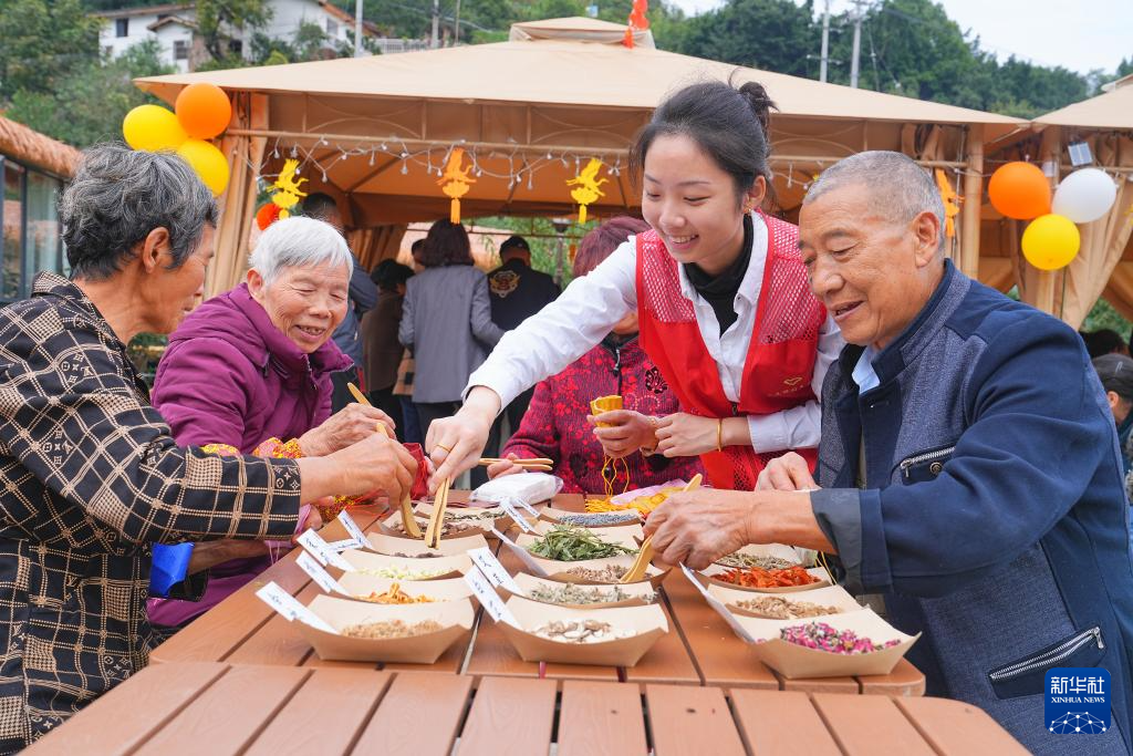 10月27日,在重慶市北碚區水土街道三元橋村,志愿者和老人們一起制作香囊。