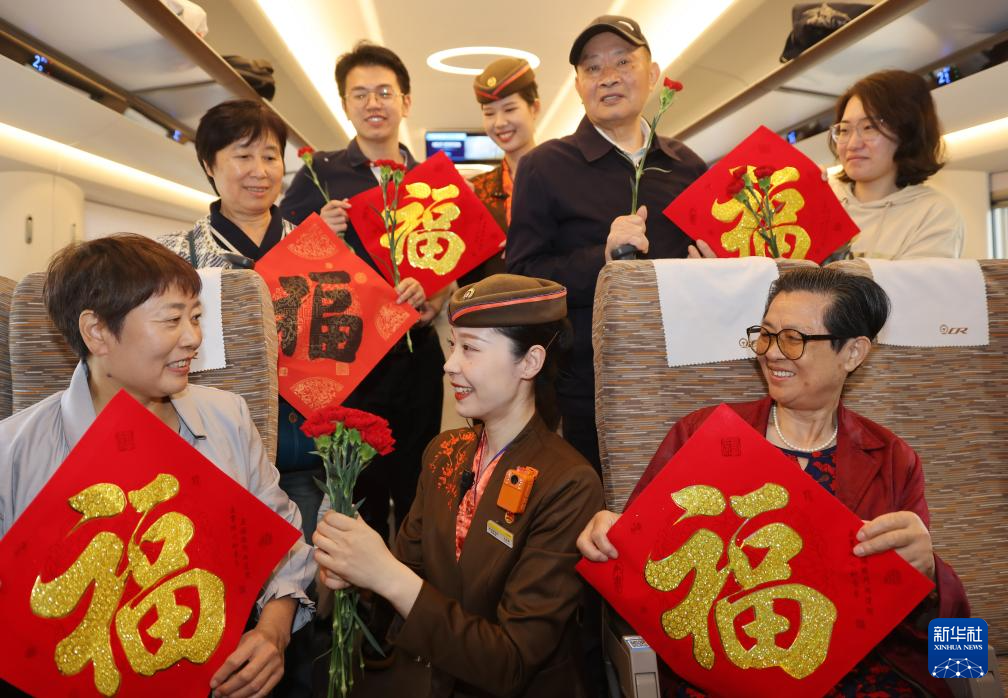 10月10日,在武漢開往大冶北D7007次列車上,武漢鐵路工作人員給老年旅客贈送康乃馨鮮花。