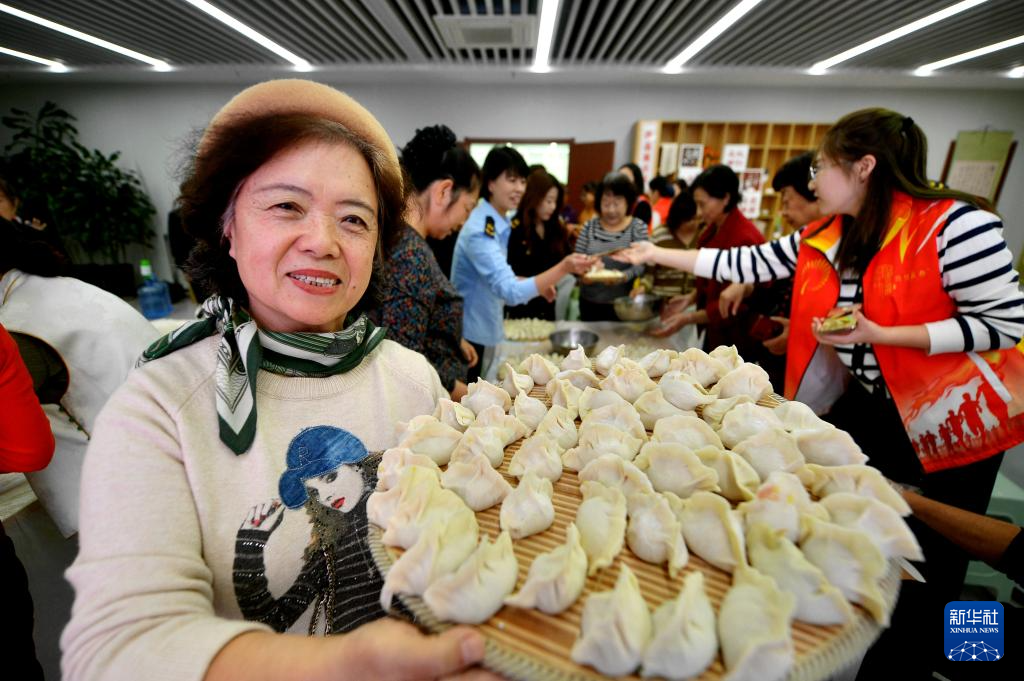 10月27日,在青島市嶗山區金家嶺街道魯信長春社區開展的迎重陽敬老活動上,老人展示包的餃子。