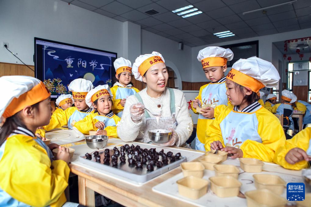 10月27日,在河南省焦作市博愛縣縣直幼兒園,老師指導小朋友在食育坊里制作重陽糕。