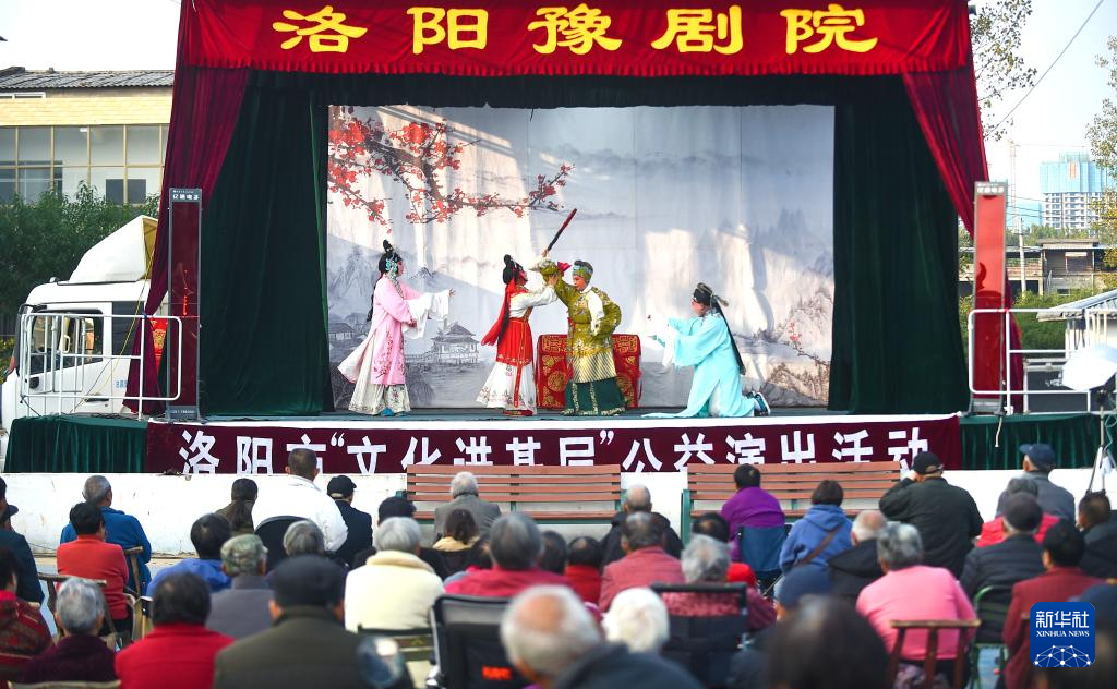 10月26日,在河南省洛陽市澗西區工農街道大所社區文化廣場舉行的重陽節公益演出活動上,洛陽豫劇院的演員們為老人表演豫劇節目。