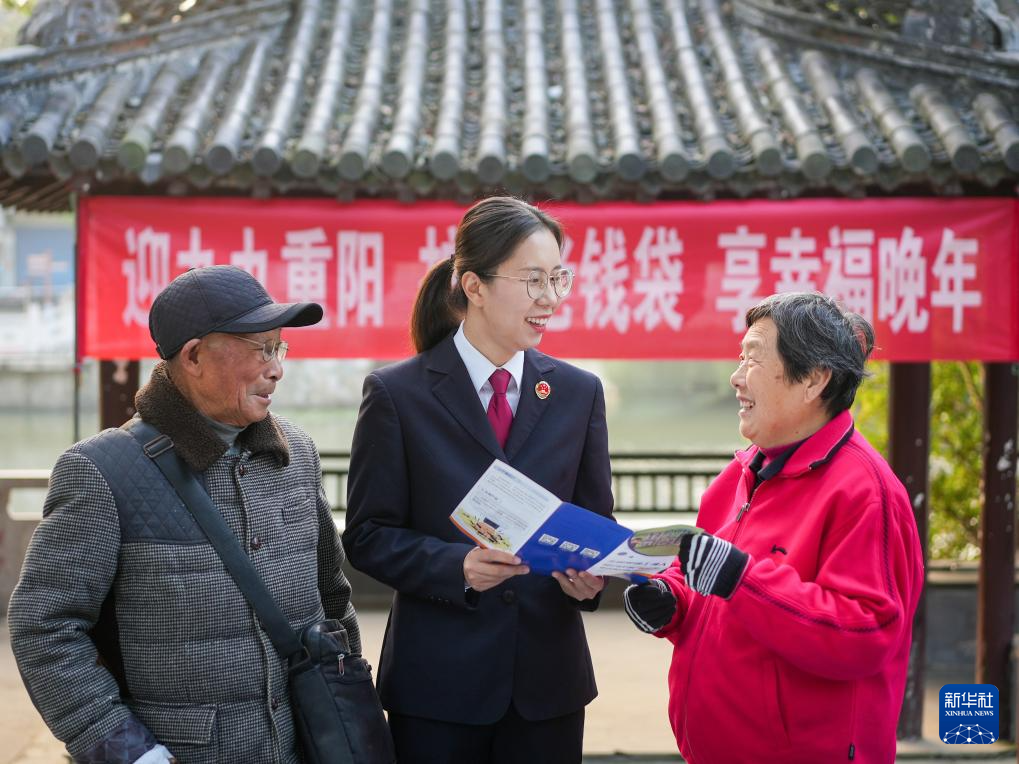 10月27日,江蘇省興化市人民檢察院法治宣講團的工作人員在公園為老年人講解有關養老法律知識。