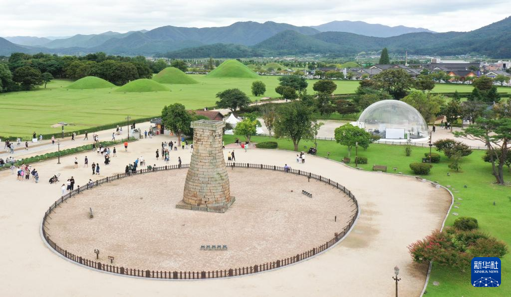 9月21日,游客在韓國慶州的歷史古跡瞻星臺附近游覽(無人機照片)。