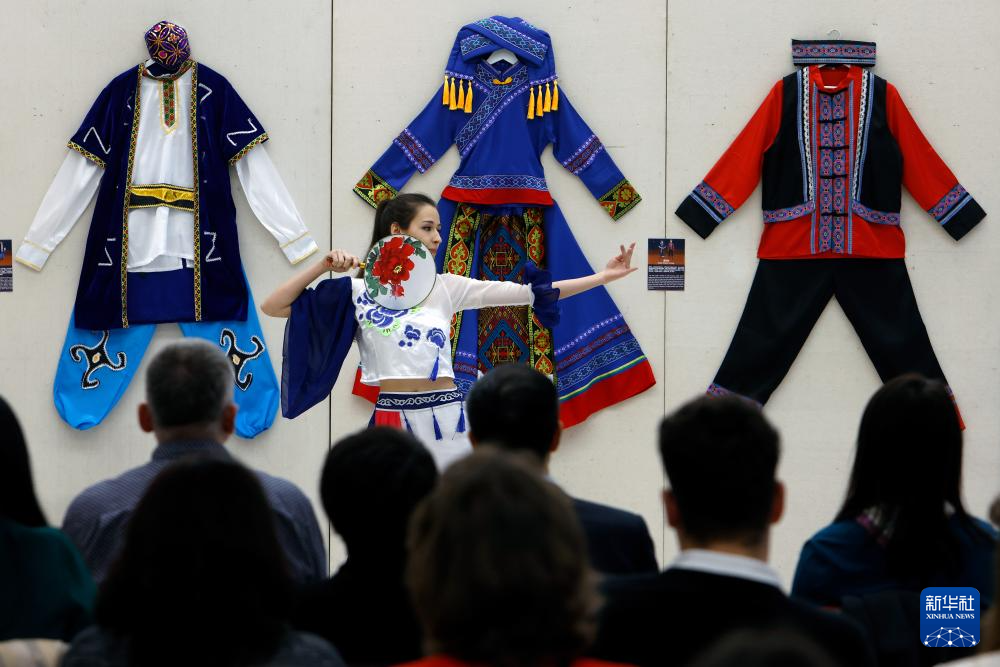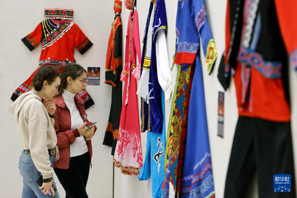 11月11日,在羅馬尼亞布加勒斯特,布加勒斯特大學的學生在“霓裳錦韻——中國少數民族服飾展”開幕式上表演。
