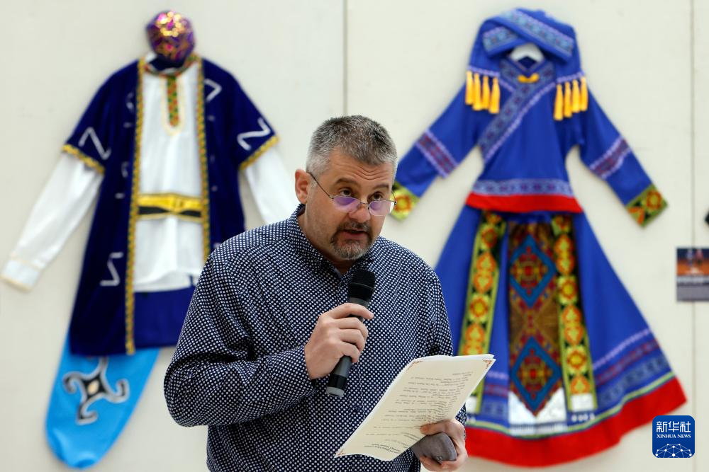 11月11日,在羅馬尼亞布加勒斯特,布加勒斯特大學副校長穆古爾·茲洛泰亞在“霓裳錦韻——中國少數民族服飾展”開幕式上致辭。