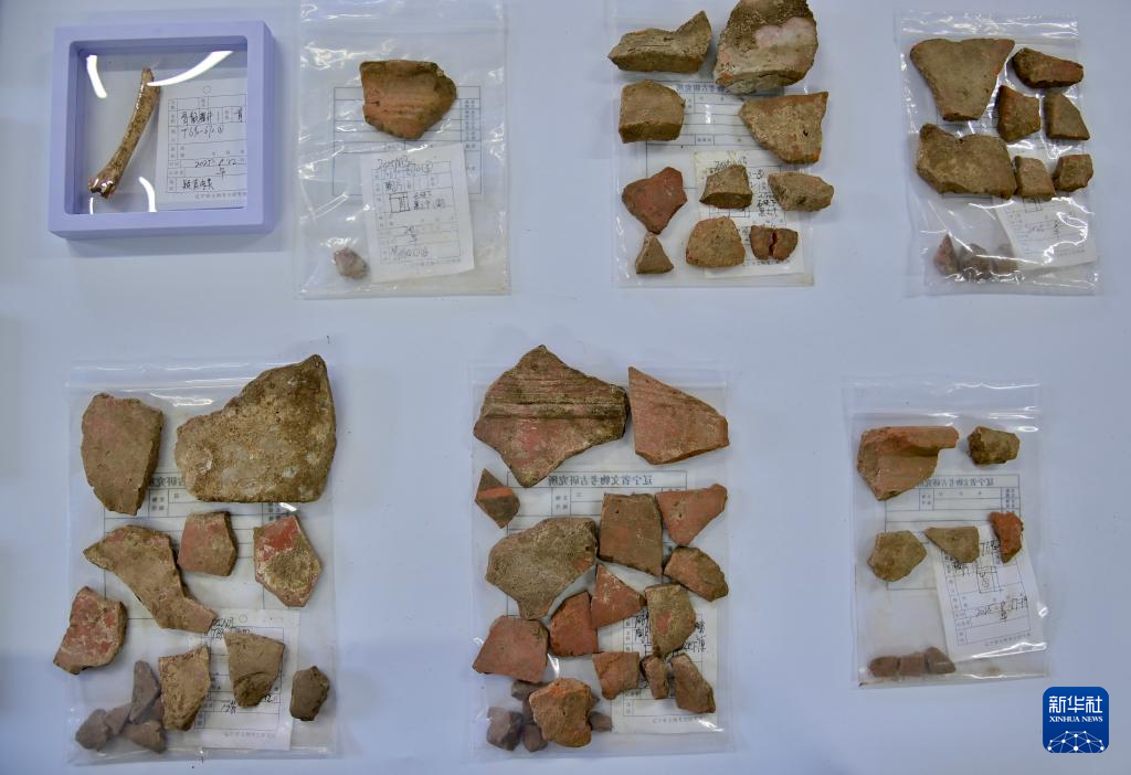 9月28日在位于遼寧朝陽的牛河梁工作站內拍攝的陶片和骨骸殘件。
