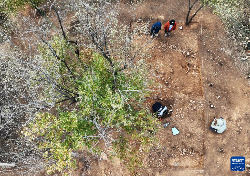 10月24日,于懷石(上右)和同事在位于遼寧朝陽的牛河梁遺址第十三地點工作(無人機照片)。