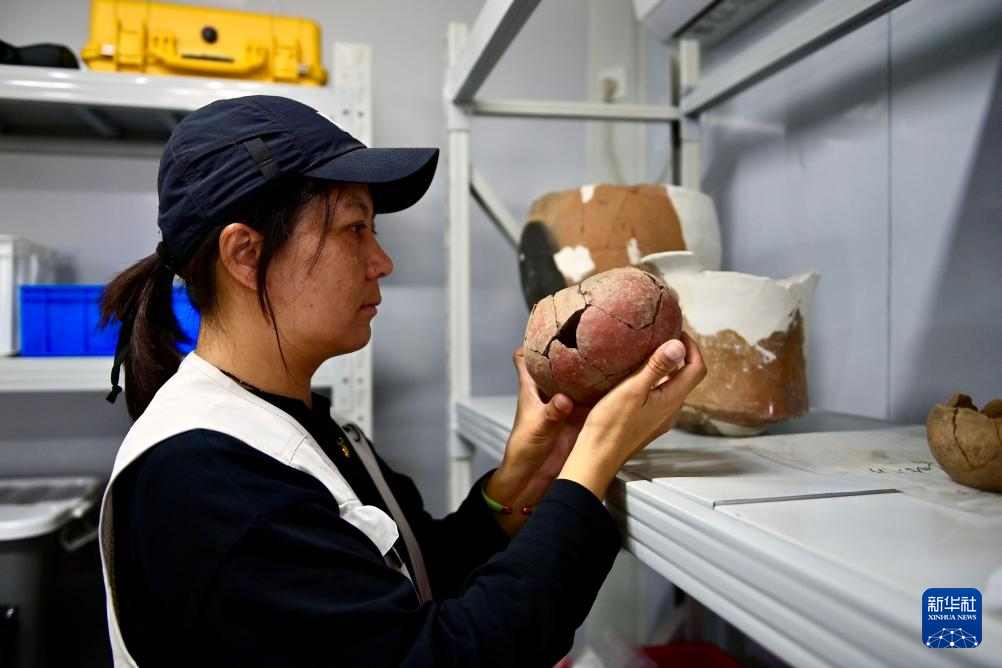 9月28日,于懷石在位于遼寧朝陽的牛河梁工作站內查看一件修復的陶罐。