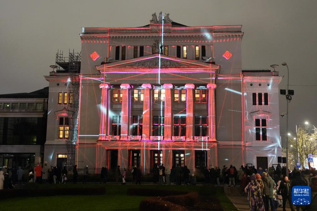 11月17日,民眾在拉脫維亞首都里加舉行的燈光節上欣賞被照亮的國家歌劇舞劇院。