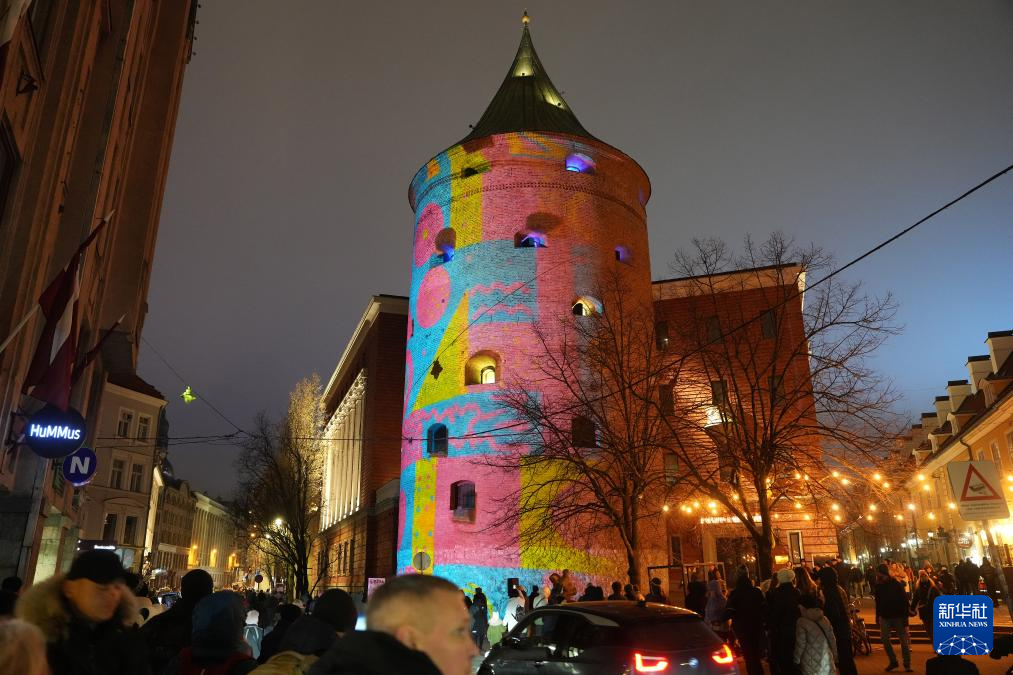 11月17日,民眾在拉脫維亞首都里加舉行的燈光節上欣賞被照亮的火藥塔。