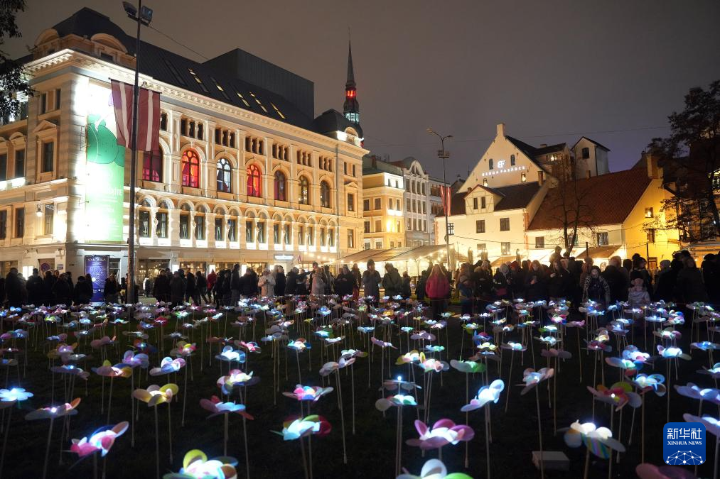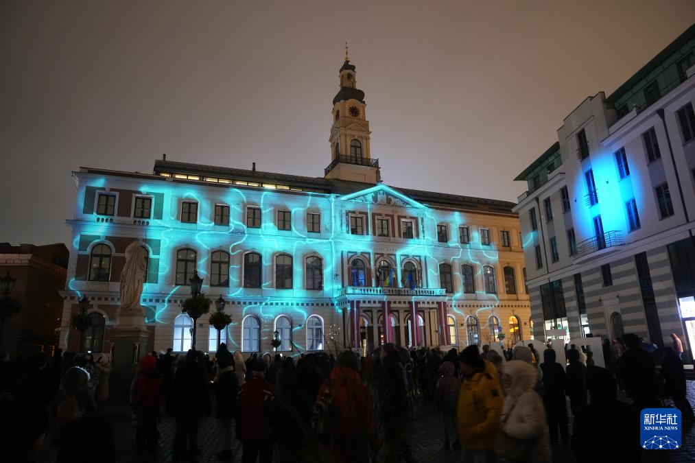 11月17日,民眾在拉脫維亞首都里加舉行的燈光節上欣賞被照亮的里加市政廳大樓。