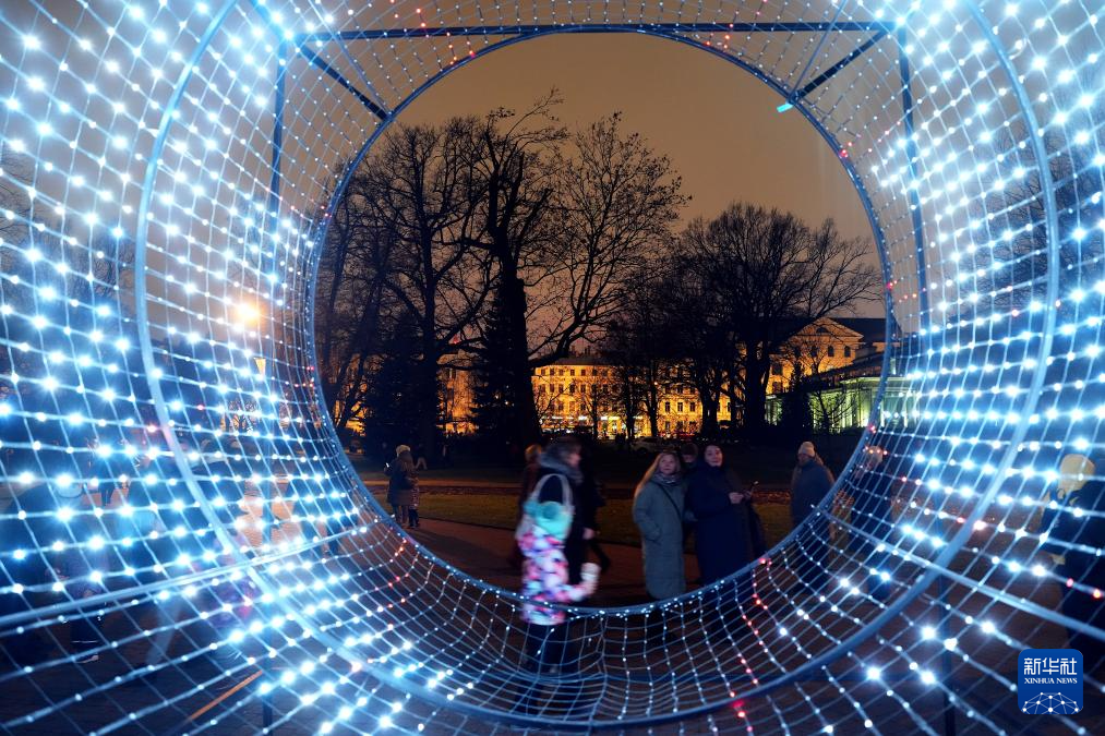 11月17日,民眾在拉脫維亞首都里加舉行的燈光節上欣賞濱海公園的燈光藝術裝置。