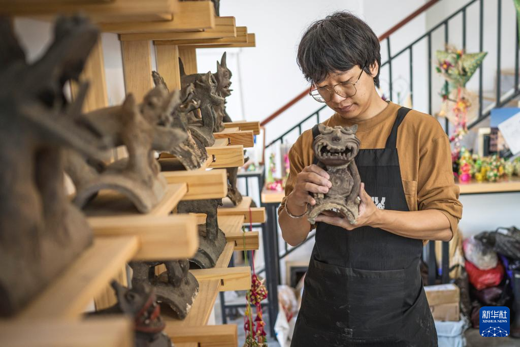 11月7日,張航在“心房瓦貓博物館”制作瓦貓。