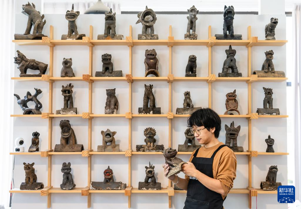 11月7日,在昆明市“心房瓦貓博物館”,張航整理收藏的瓦貓。