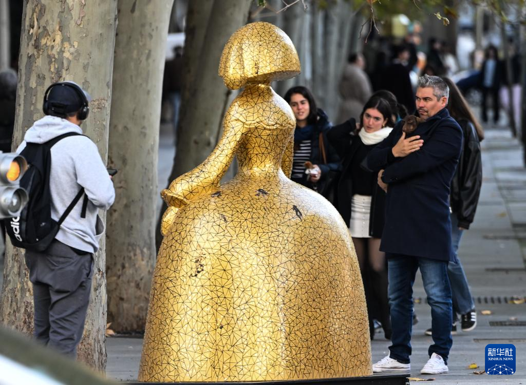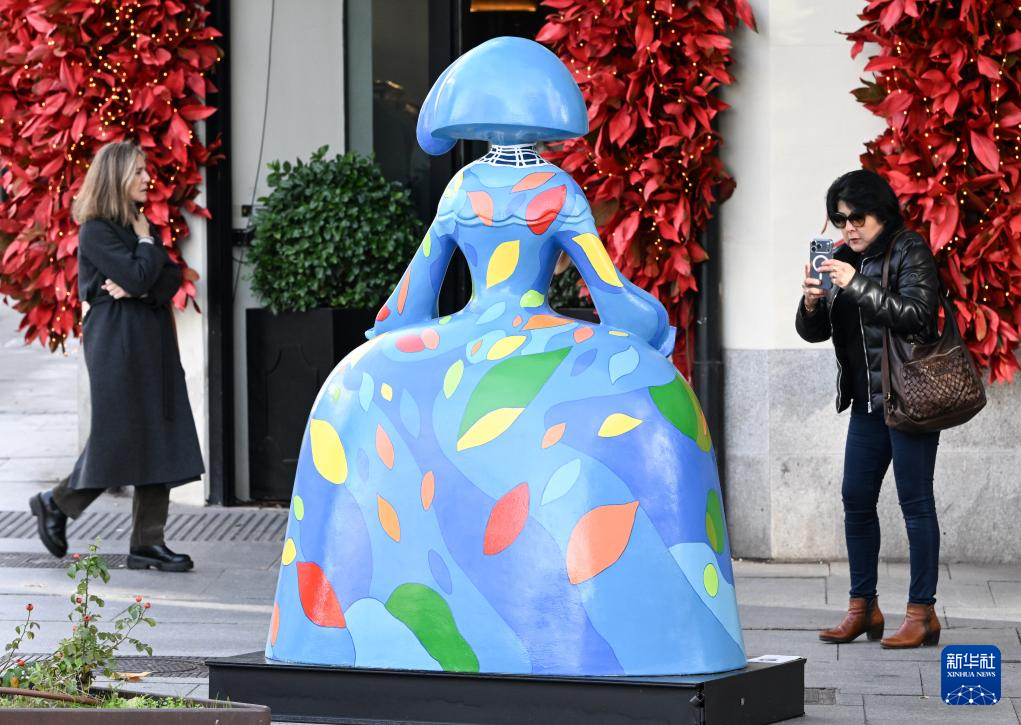 11月19日,行人在西班牙馬德里街頭欣賞“宮娥”主題雕塑。