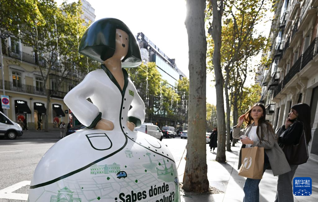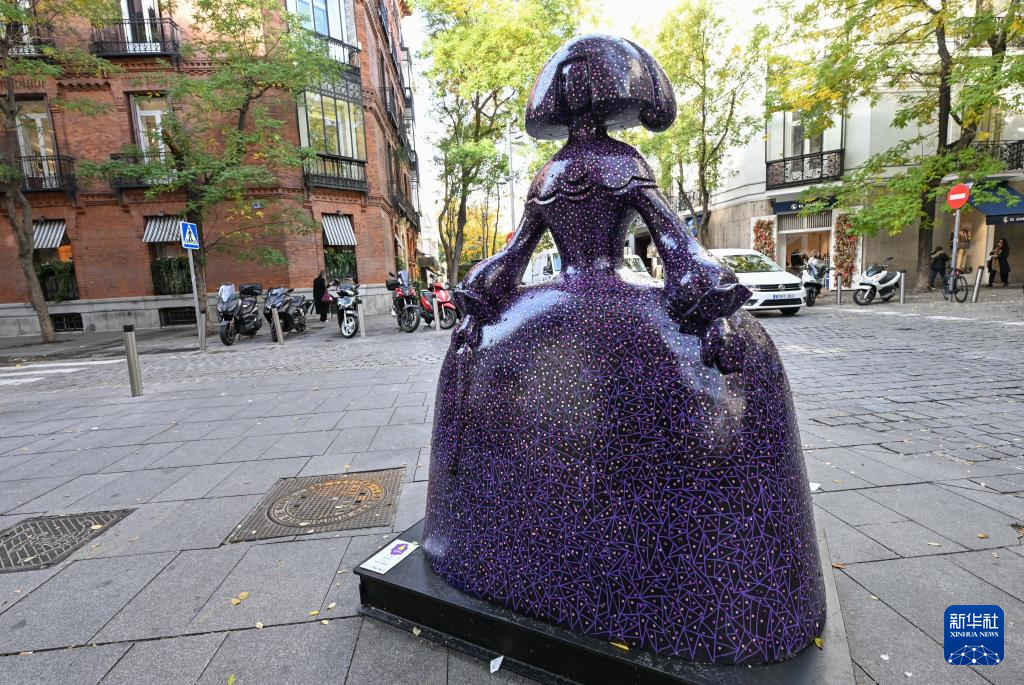這是11月19日在西班牙馬德里街頭拍攝的“宮娥”主題雕塑。