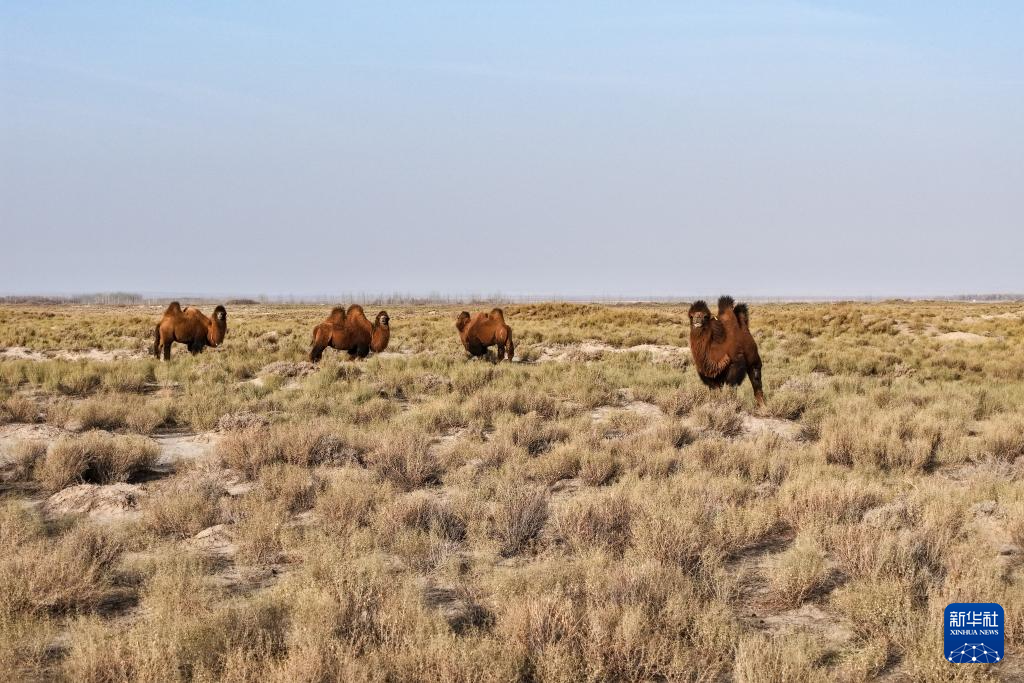 11月18日,一群駱駝在甘肅省瓜州縣鎖陽城鎮的鎖陽城遺址外活動覓食(無人機照片)。