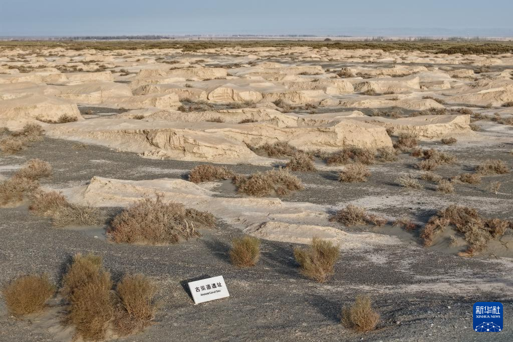 這是11月18日在甘肅省瓜州縣拍攝的農業灌溉渠系遺跡中的古渠道遺址(無人機照片)。