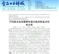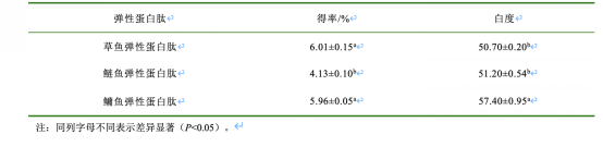 “五個女博士”研究人員對分別研究了草魚、鰱魚和鳙魚的動脈球制備彈性蛋白肽,并對其理化特性進行比較分析。結果顯示,草魚彈性蛋白肽的制備得率最高,鳙魚的彈性蛋白肽的白度最高,鰱魚彈性蛋白肽中鎖鏈素和異鎖鏈素總含量最高,草魚彈性蛋白肽對ABTS自由基的清除能力最大。