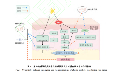 研究人員通過總結大量研究發現,彈性蛋白肽具有較強的抗氧化活性,能夠抑制自由基在皮膚中的積累,有效減輕皮膚的氧化應激損傷,從而延緩皮膚光老化的過程。此外,彈性蛋白肽還能夠抑制基質金屬蛋白酶,減少皮膚彈性蛋白的降解,促進皮膚成纖維細胞增殖與彈性蛋白合成,從而發揮抗皮膚衰老的作用功效。值得一提的是,有研究發現彈性蛋白肽和膠原蛋白肽在促進皮膚膠原蛋白和彈性蛋白合成、改善皮膚狀況和延緩皮膚衰老等方面具有協同增效的作用。