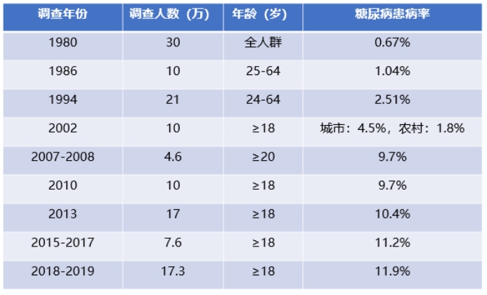 "糖尿病"這一健康議題長期以來都備受社會各界的密切關注。尤其令人憂慮的是,在過去的30多年間,我國糖尿病的患病率顯著上升(表1),這一現象無疑加深了公眾的擔憂情緒。那么,您對糖尿病的了解究竟有多少呢?接下來,本文將從糖尿病的基本概念、常見癥狀、類型劃分以及可能引發的并發癥等多個維度,全面細致地解讀糖尿病的基本知識。