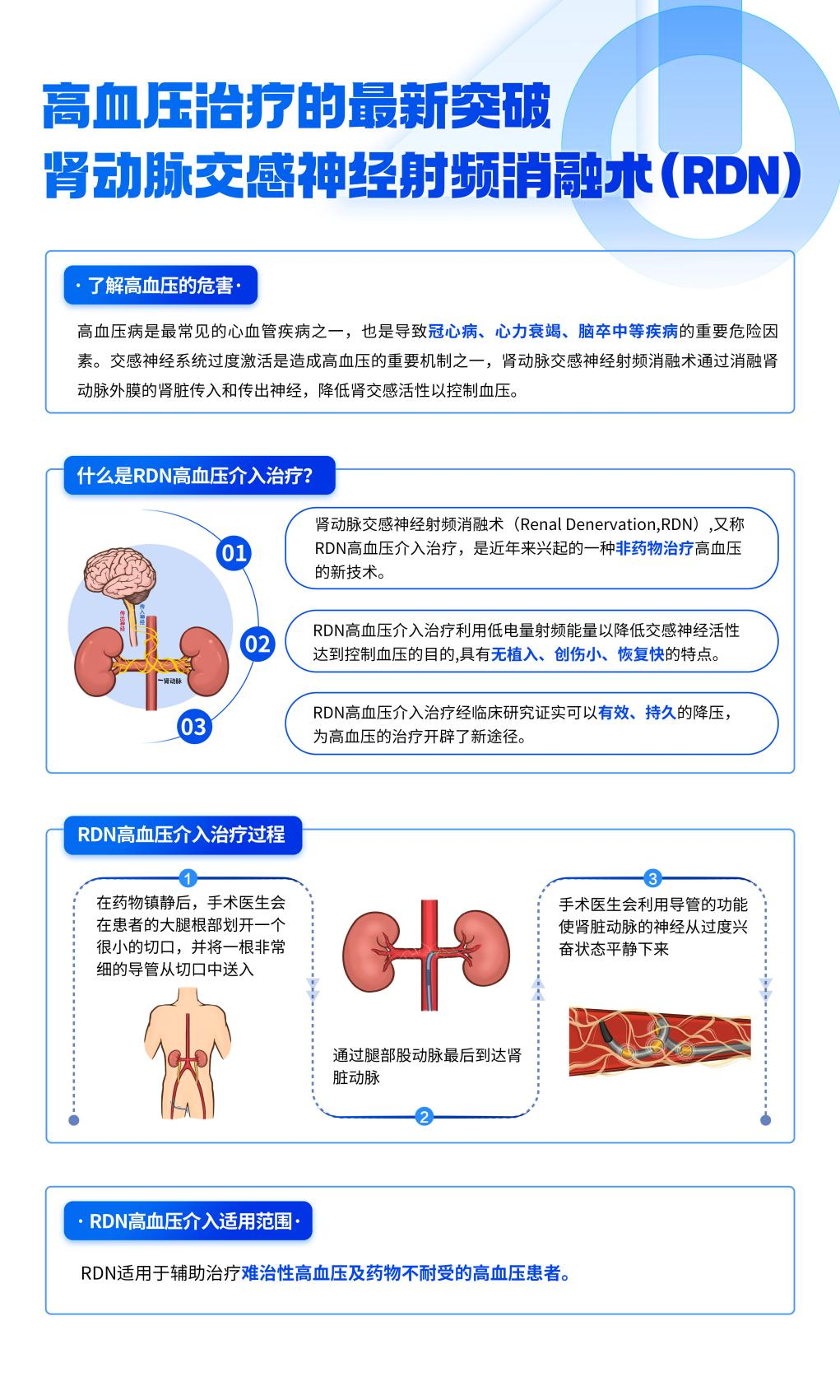 近年來,腎動脈去交感神經術(Renal Denervation RDN又稱RDN高血壓介入治療)逐漸被應用于高血壓治療,為提高我國家高血壓控制率提供了新的手段。據悉,2024年,國家藥品監督局已批準了國內外多個廠家上市使用RDN高血壓介入治療創新產品。為難治性高血壓及藥物不耐受的高血壓患者帶來了治療的新希望?!?/p>