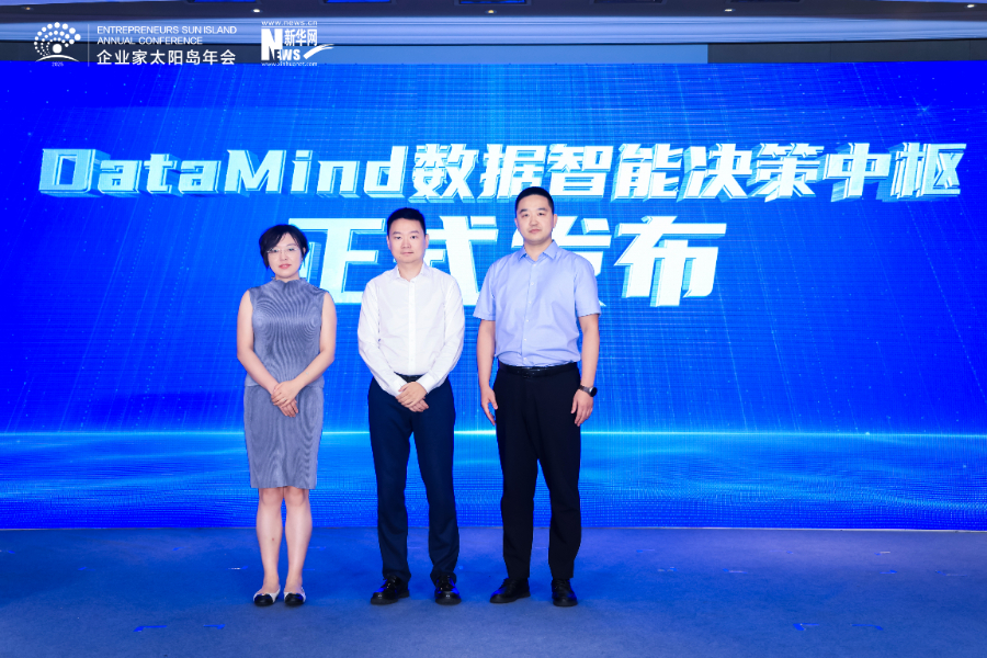 圖為“DataMind數據智能決策中樞”發布儀式。中科聞歌副總經理武學敏(左一)、中綠訊科總經理孔飛(左二)、新華網數字經濟事業中心總監李想(右一)共同發布。新華網發