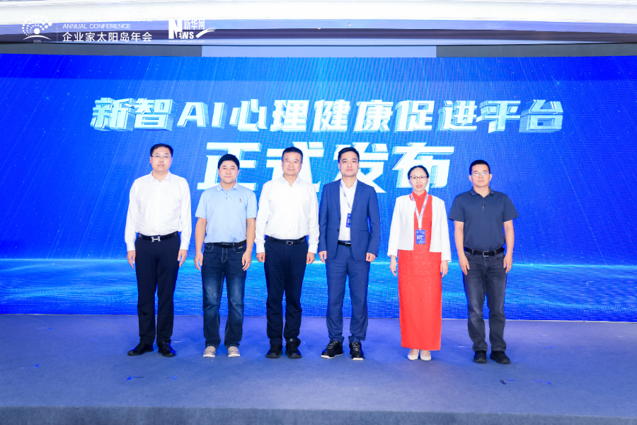 圖為“新智AI心理健康促進平臺”發布儀式。新華網首席信息官姚予疆(左三),上海市心理學會員工心理促進工作委員會主任、教授畢玉芳(右二),清華大學集成電路學院與軒任聯合研發負責人王光奇(左二),上海軒任科技集團創始人兼CEO劉祖光(右三),上海軒任科技集團董事長李克儉(左一),北京聚信成眾董事長李永清(右一)共同發布。新華網發