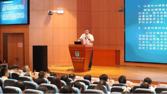 廣州大學馬克思主義學院院長趙中源以《中國共產黨與國家治理現代化》為題表示,國家治理從傳統管制轉向現代民主,注重科學、民主、依法及智慧執政,中國治理理性是政治現代化創造,兼顧安全與發展,回應需求轉變及治理主體多元,協同主體博弈。