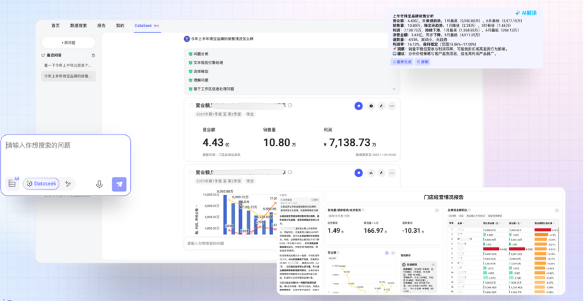 據沙海洲介紹,目前北極九章的核心產品是以用戶簡單提問為“分析原點”,模擬數據分析師推演問題路徑,如拆解“毛利率下降”原因鏈,將模糊問題轉化為明確數據指標,精準生成并執行分析邏輯,最終輸出高價值結論。支撐這一能力的是“左腦數據模型+右腦語言模型”雙架構——左腦負責嚴謹數據映射,右腦負責理解業務語義。