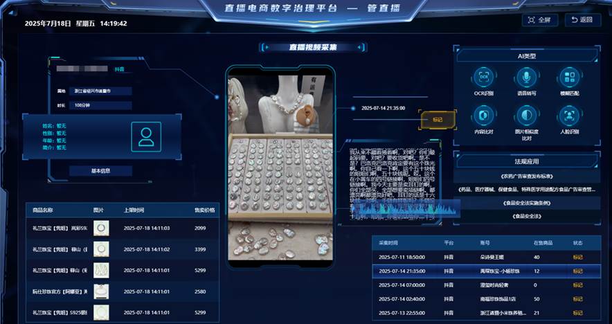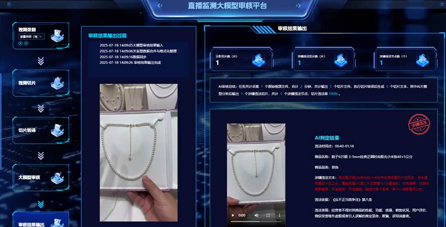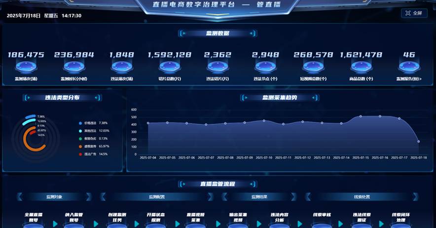 目前已完成了三個場景建設,一是直播行為“云眼監測”:系統24小時全天候無感監測直播行為、商品及評價等核心指標。通過AI切片分析、語音識別、圖像比對,自動抓取并定位疑似違法線索,并通過人工復審增強違法線索核查處置精度;二是違法線索“云端固證”:利用區塊鏈存證平臺,將違法線索一鍵上鏈固證,自動生成具有法律效力的規范固證文書,確保證據法律效力。三是監測數據“云腦分析”:依照直播間地域分布形成“直播地圖”,并以違規程度為標準實施四色分類,實時標注開播狀態,對自動生成的月度監測報告和日常投訴舉報反饋的虛假宣傳、違法廣告、價格欺詐等6類高頻違法違規行為實施重點監測,使行業重點直播間違法行為發生率大幅下降。