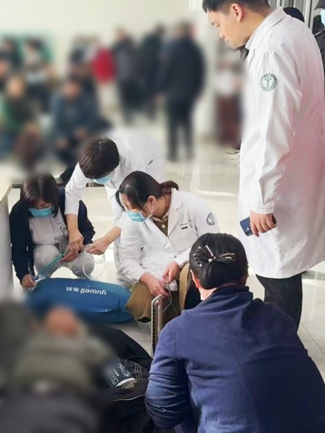 應急呼叫發出后,診區護士與急診科醫生攜急救設備第一時間抵達現場;物業與安保人員同步開辟救援通道、維護秩序;護士長現場統籌,門診辦公室負責人一線指揮。多部門人員在極短時間內形成高效搶救單元,展現了醫院應急響應的系統化協作能力。