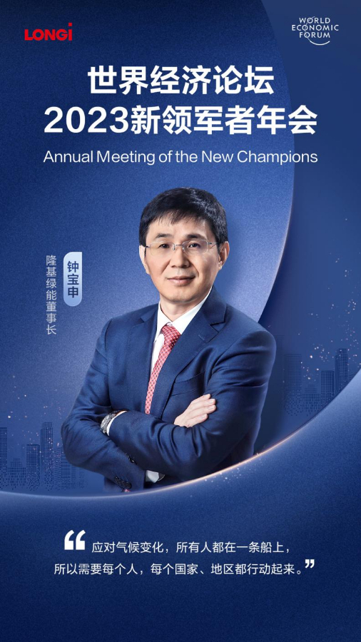 6月27至29日,世界經濟論壇第十四屆新領軍者年會(又稱“夏季達沃斯論壇”)在天津舉辦,隆基綠能董事長鐘寶申參會,在“凈零排放的英雄?工業園區脫碳”分論壇、“中國能源轉型”閉門會議發言。
