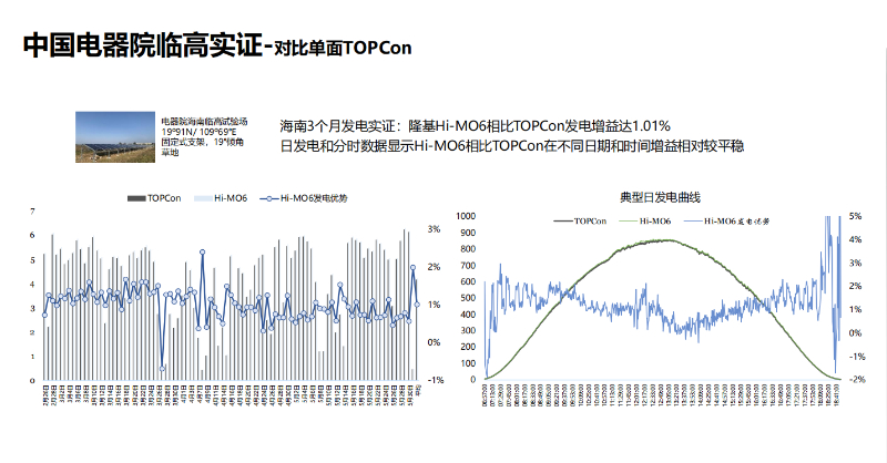 來自隆基綠能中央研究院研究員胡國波博士,向大家分享了中國電器院、河南南陽工商業屋頂的實證案例,實證表明采用隆基綠能HPBC電池的Hi-MO X6組件在同等條件下比單面的TOPCon組件有1%以上的發電增益。