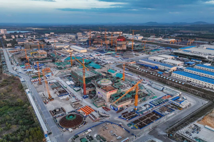 從??诿捞m機場到位于昌江的海南核電基地,將近3個小時的車程之后,在藍天碧海旁,記者們看到了“雙龍齊飛,三堆共建”的震撼景象——“華龍一號”海南核電3、4號機組正在建設當中,與之同期建設的還有被譽為“核能充電寶”的我國另一自主創新重大成果“玲龍一號”。