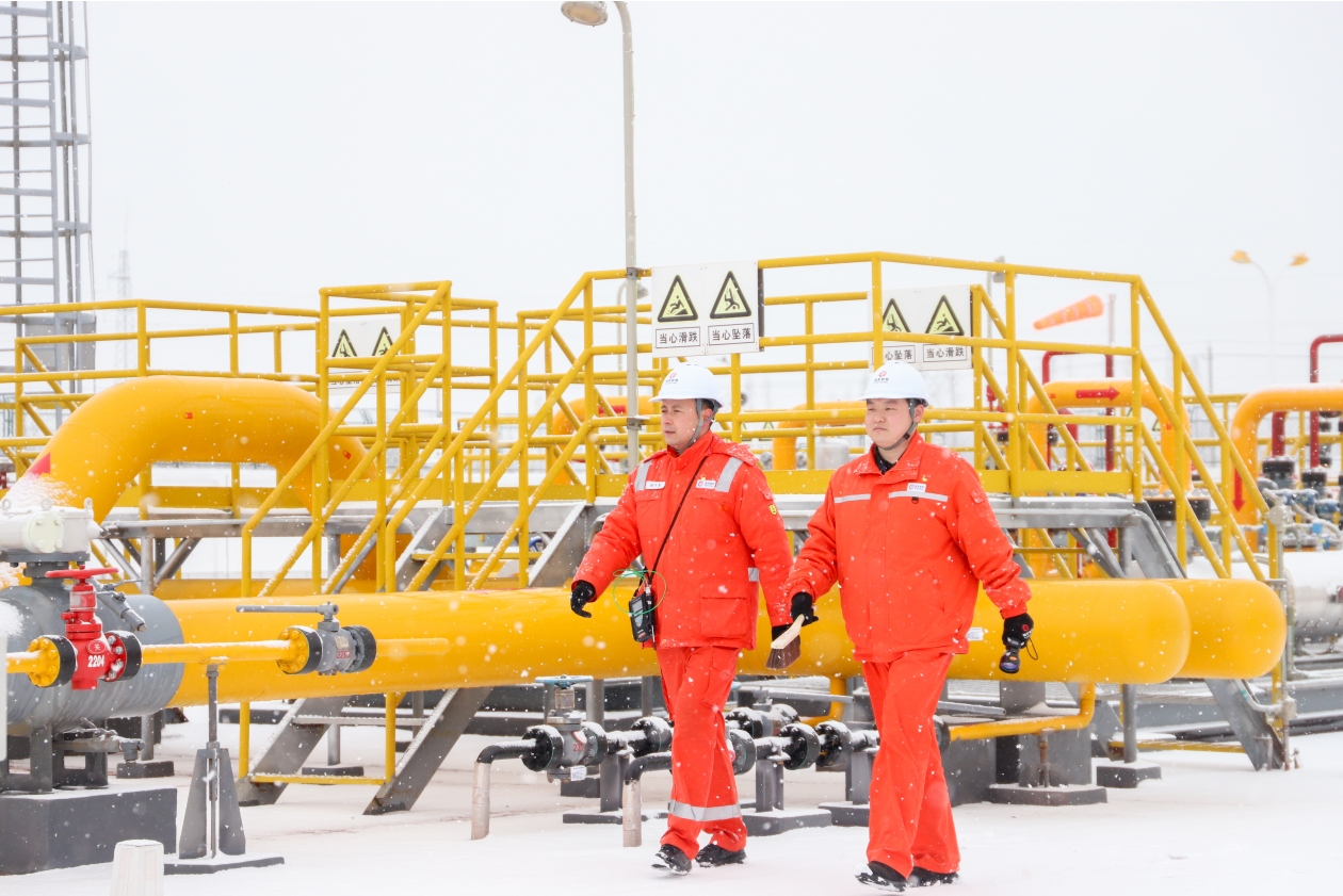 "黑龍江肇源,中俄東線天然氣管道肇源作業區員工在雪中全面巡檢站場設備和管道沿線設施,保障管道安全平穩運行。"