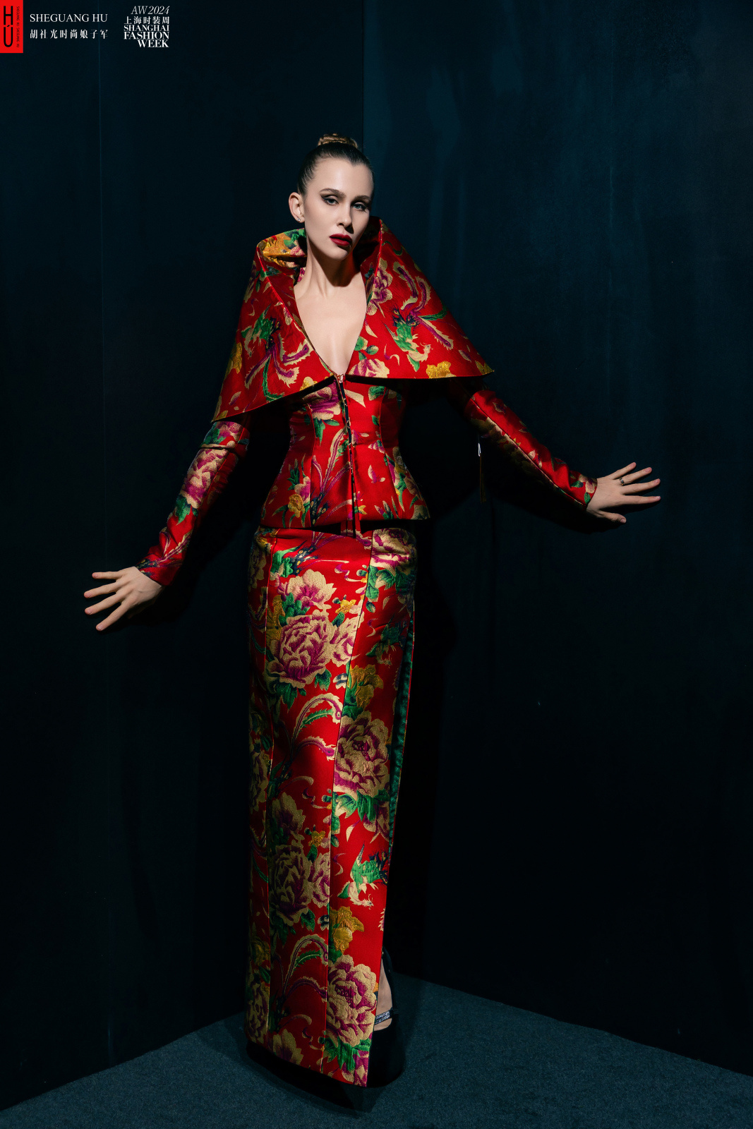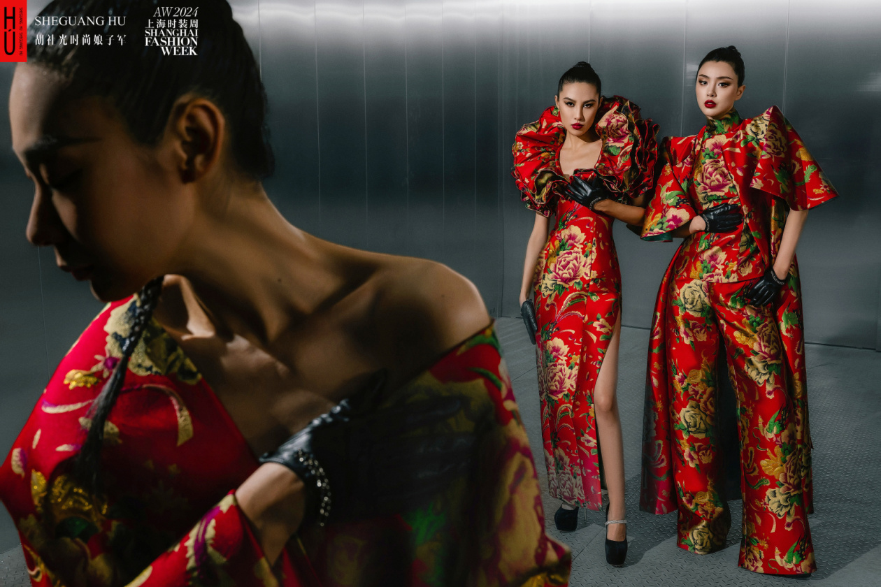 談到海派的時候,胡社光說:“要理解上海,就要追憶這座城市獨有的漸進、往返、突變、瓦解、重塑的歷史,這個過程形成了上海變遷的無序和秩序,生活在其中的小人物命運帶著不可抗爭的性質。旗袍、皮草、西裝大衣、斗篷、風衣、禮服等服裝款式,卷發、紅唇、柳葉眉、男人的胡須和領結等造型樣貌,都成為摩登最好的詮釋,濃艷也好、嫵媚也好,都成為歌舞升平不夜城的格調。每個小人物仿佛被時代推著往前奔,浮夸的行頭和精致的首飾成為最切實的人生。東北大花誕生于上海有其必然性,而我選擇東北大花進行創作,也有我人生故事的啟迪,我相信,東北大花一再火爆、引發國人的關注,勢必與每個人對這種紋樣的記憶、情緒有關。在我們自己的直播間中,‘東北大花’高定旗袍和西服套裝,已經銷售接近上萬件,成為了我自己長紅的代表作品之一?!?/p>